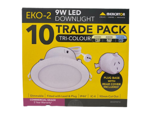 The Mercator Eko-2 9W 90mm 3CCT LED Downlight With Plug Base 10 Pack is a practical and versatile lighting solution for residential and commercial spaces. Designed for easy installation, each downlight is fitted with a lead and plug base and features an integrated driver for a neat, efficient setup. With a 90mm cut-out, IC-4 rating and IP44 front face protection, this pack is well suited to a range of indoor applications including living areas, kitchens, hallways and other spaces where reliable everyday lighting is needed.