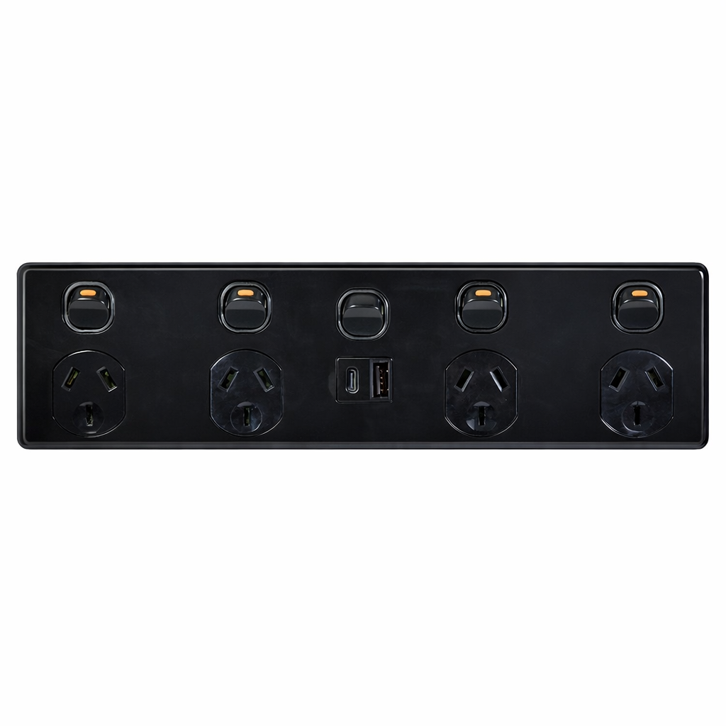 The Trader Puma PU4X2ACSWBK is a practical and modern 4 gang power point designed to combine everyday power access with convenient USB charging in one streamlined unit. Finished in black, this model features four 10A 250V double pole power points along with a fully integrated 2 gang USB charger with Type A and Type C connections, making it a smart choice for homes, offices, kitchens, study areas and commercial spaces where charging flexibility is essential. Designed for convenience and performance, the PU4X2ACSWBK includes wide spacing between power points to better suit larger plug bases and also comes with a removable extra switch for added functionality. It fits standard wall boxes and mounting accessories, while the cover, plate and dollies are made from UV stabilised polycarbonate to help resist yellowing over time. Suitable for USB Type C applications up to 3 Amp at 5V, this Trader Puma power point offers a neat and versatile solution for spaces that need both reliable power outlets and integrated charging options.