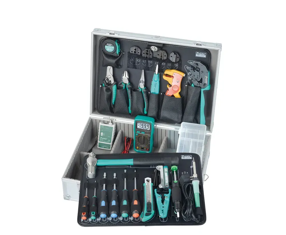 PK-4302 is a professional PC Networking Tool Kit, including Digital Multimeter、Tester、Crimper、Stripper、Pliers、Punch Down Tool and Soldering Iron for system integrators and MIS engineers of computer repairing and networking installation.