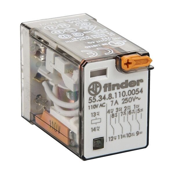 Finder 55 Series Miniature Relay 7A 4CO 110VAC Coil with LED Test Button & Mechanical Indicator