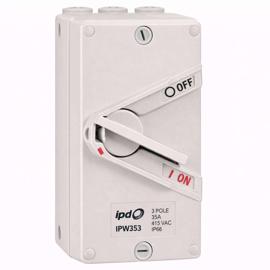 The IPD IPW353 Padlockable Weatherproof Isolator is a compact and reliable isolation switch designed for safe switching in demanding commercial and industrial environments. With a 3 pole configuration, 35A current rating and 415V operation, this weatherproof isolator is ideal for applications that require dependable local isolation and strong protection against dust and water ingress. Its IP66 rating makes it well suited to harsh Australian conditions. Built for durability and installation flexibility, the IPW353 features four M25 gland entries and supports cable cross sections up to 25 sq-mm. It also offers a rated insulation voltage of 500 VAC, dielectric strength of 1 kV, a rated short time withstand current of 0.76 kA and a short circuit capacity of 1.5 kA. Compact in size, it measures 82.5mm wide, 167mm high and 89mm deep, making it a neat and efficient solution for a wide range of switching applications.