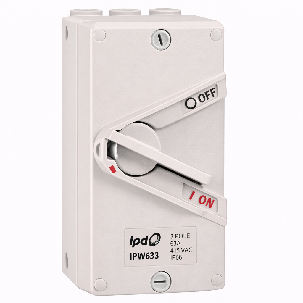 The IPD IPW633 Padlockable Weatherproof Isolator is a durable and reliable isolation switch designed for safe switching in demanding commercial and industrial environments. With a 3 pole configuration, 63A current rating and 415V operation, this weatherproof isolator is ideal for applications that require dependable local isolation and strong protection against dust and water ingress. Its IP66 protection rating makes it well suited to harsh Australian conditions. Built for durability and installation flexibility, the IPW633 features four M25 gland entries and supports cable cross sections up to 25 sq-mm. Its compact enclosure measures 82.5mm wide, 167mm high and 89mm deep, making it a neat and efficient solution for a wide range of switching applications where space, protection and performance matter.