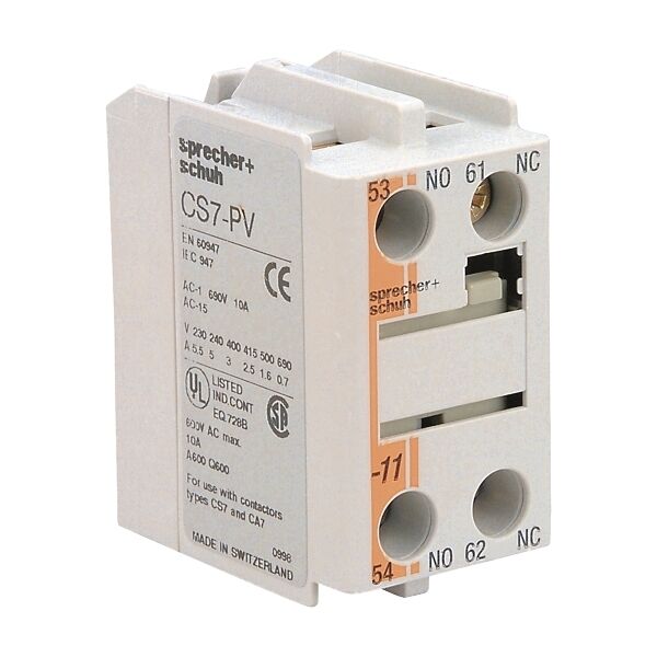 The Sprecher + Schuh CS7PV20 is a top-mounted auxiliary contact block designed for use with CS7 industrial control relays. Featuring two normally open (2NO) contacts, this auxiliary block provides reliable signalling and control circuit expansion in industrial automation and control applications.