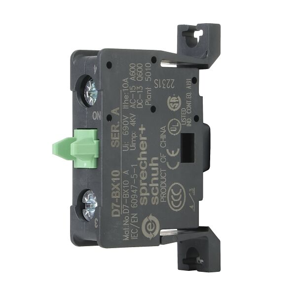 The Sprecher + Schuh D7BX10 is a base-mounted auxiliary contact block designed for use with 22.5mm D7 series pushbutton operators. Featuring 1 Normally Open (NO) contact, it provides reliable switching performance for industrial control and automation applications. Part of the D7 operator control range, this modular contact block allows easy configuration and assembly within control panels and machinery.