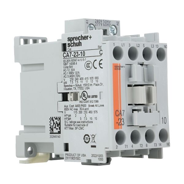 The Sprecher + Schuh CA72310240VAC is a 3-pole IEC power contactor designed for reliable AC motor switching in industrial control applications. Rated at 11kW at 400V AC and fitted with a 240VAC control coil, this contactor is ideal for direct-on-line (DOL) motor starting and general power switching duties.