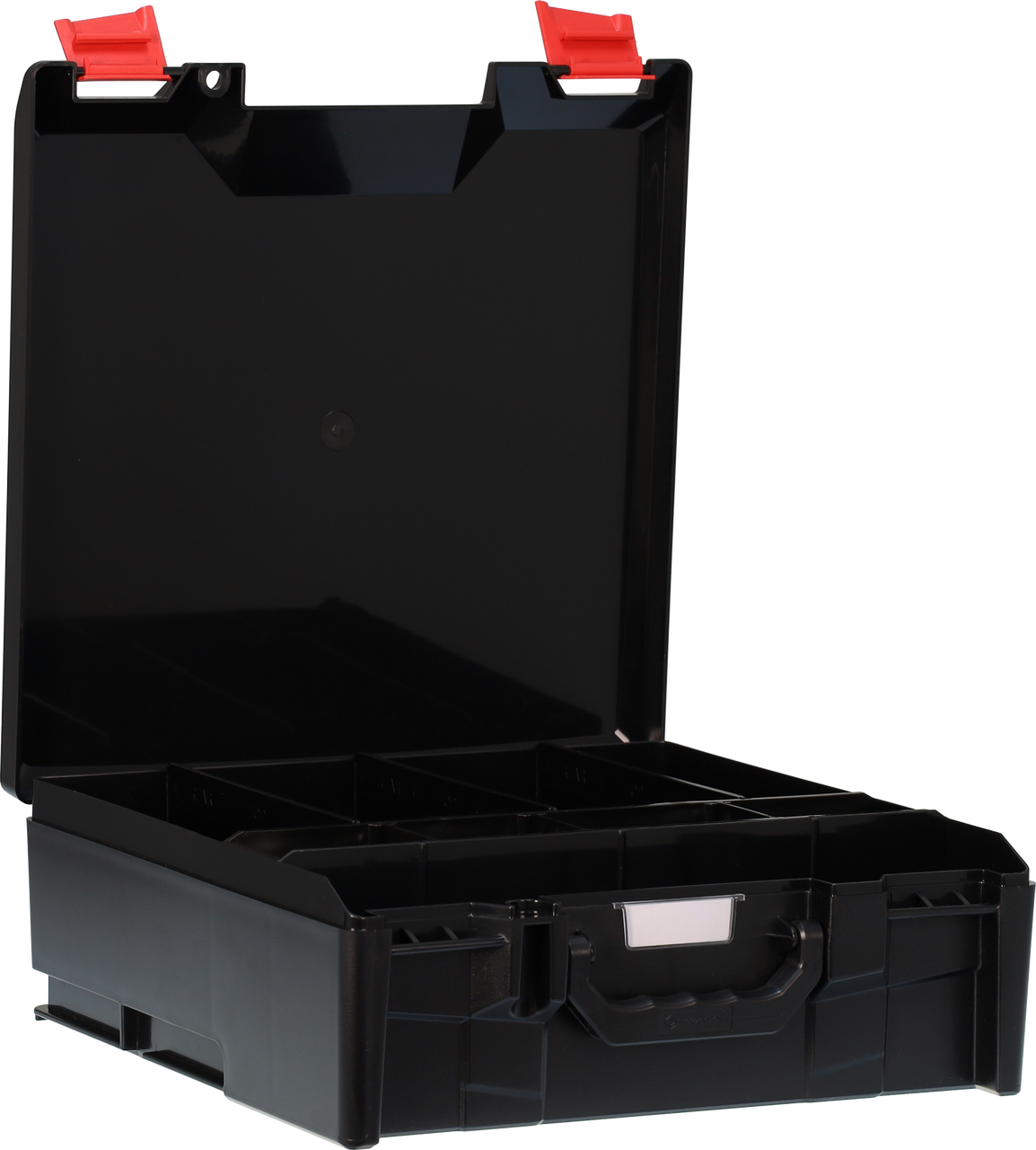 This is a large ABS Black Case with a solid ABS colored lid. These cases are suitable for Electricians, Plumbers, Data Cable installers, HVAC, TV Antenna Installers, Mechanics and many others in business, office, workshop or at home. A visually styled outlook providing a true tradesman carry and storage case for all their parts.