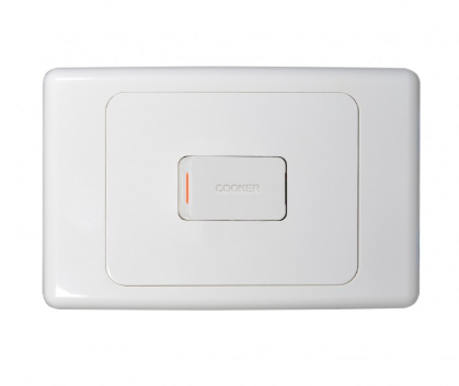 The COSWDPOV45H from the Trader Cougar range is a heavy duty oven isolation switch designed for residential and commercial kitchen appliances. Rated at 45A and 250V, this double pole switch isolates both active and neutral conductors for safe appliance servicing and installation. This model features a horizontal switch orientation and is commonly used for ovens, cooktops and other high load appliances. The plate and dolly are manufactured from UV stabilised polycarbonate to resist discolouration and maintain a clean appearance over time. Designed to suit standard Australian wall boxes, the switch also includes large terminals capable of accommodating heavier cable sizes required for high current appliances.