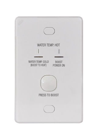 Indicator lights on the front plate give the status of the hot water system, ie: Hot, Cold or Boost Required.